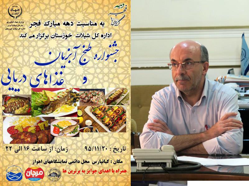 به گزارش روابط عمومی شیلات خوزستان ، دکتر نبی اله خون میرزایی با اعلام این خبر افزود: همزمان با دهه مبارک فجر و با هدف ترویج فرهنگ مصرف آبزیان، افزایش سطح سلامت جامعه ، معرفی ارزشهای غذایی فراوان ماهی و میگو و معرفی تنوع شیوه های طبخ آبزیان، جشنواره طبخ غذای آبزیان و غذاهای دریایی در شهرستان اهواز برگزار می شود.